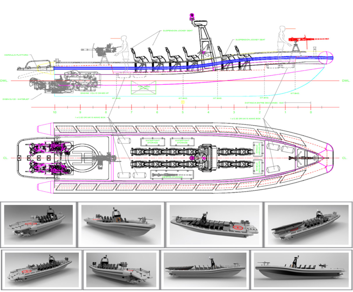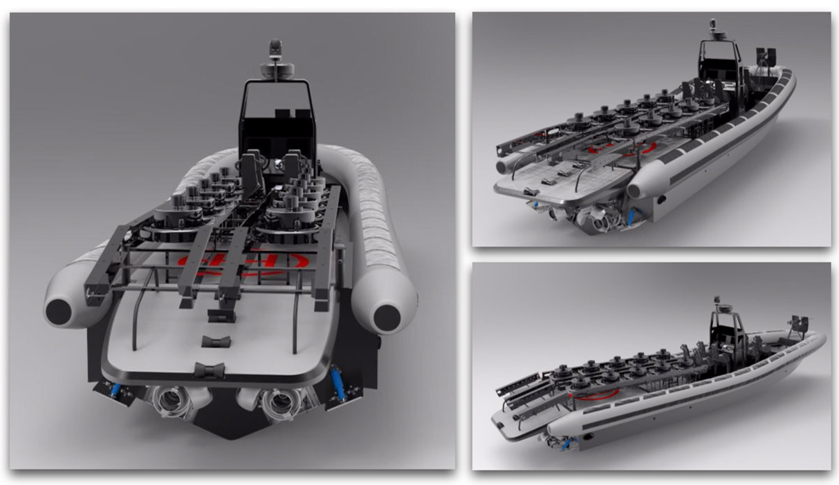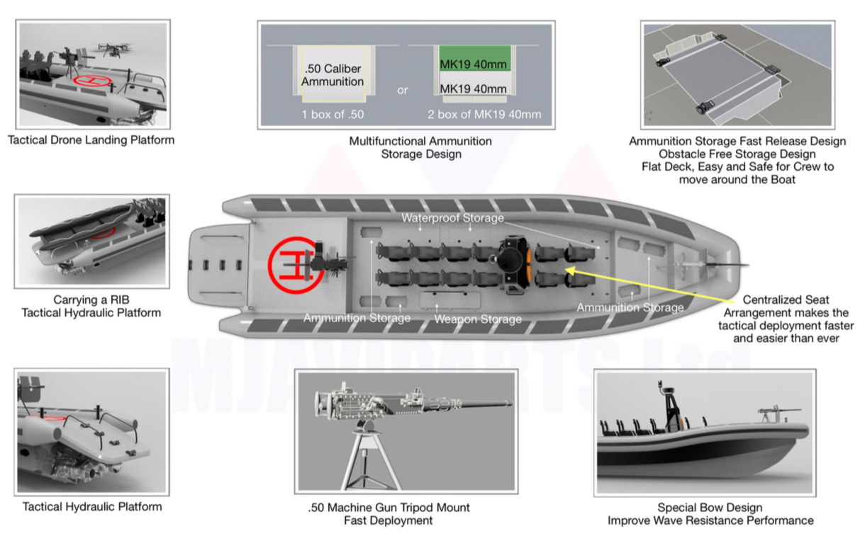 The design idea of RH-1212 is to fully upgrade the prototype of RHIB serving in Navy Seal, USA. With the latest world class turbo jet engine, the multi-functional hydraulic tactical platform, and the outstanding hull design, RH-1212 not only bring the future combat concept to reality butalso fully content the combat demand of special force operations and counter-terrorismoperations.