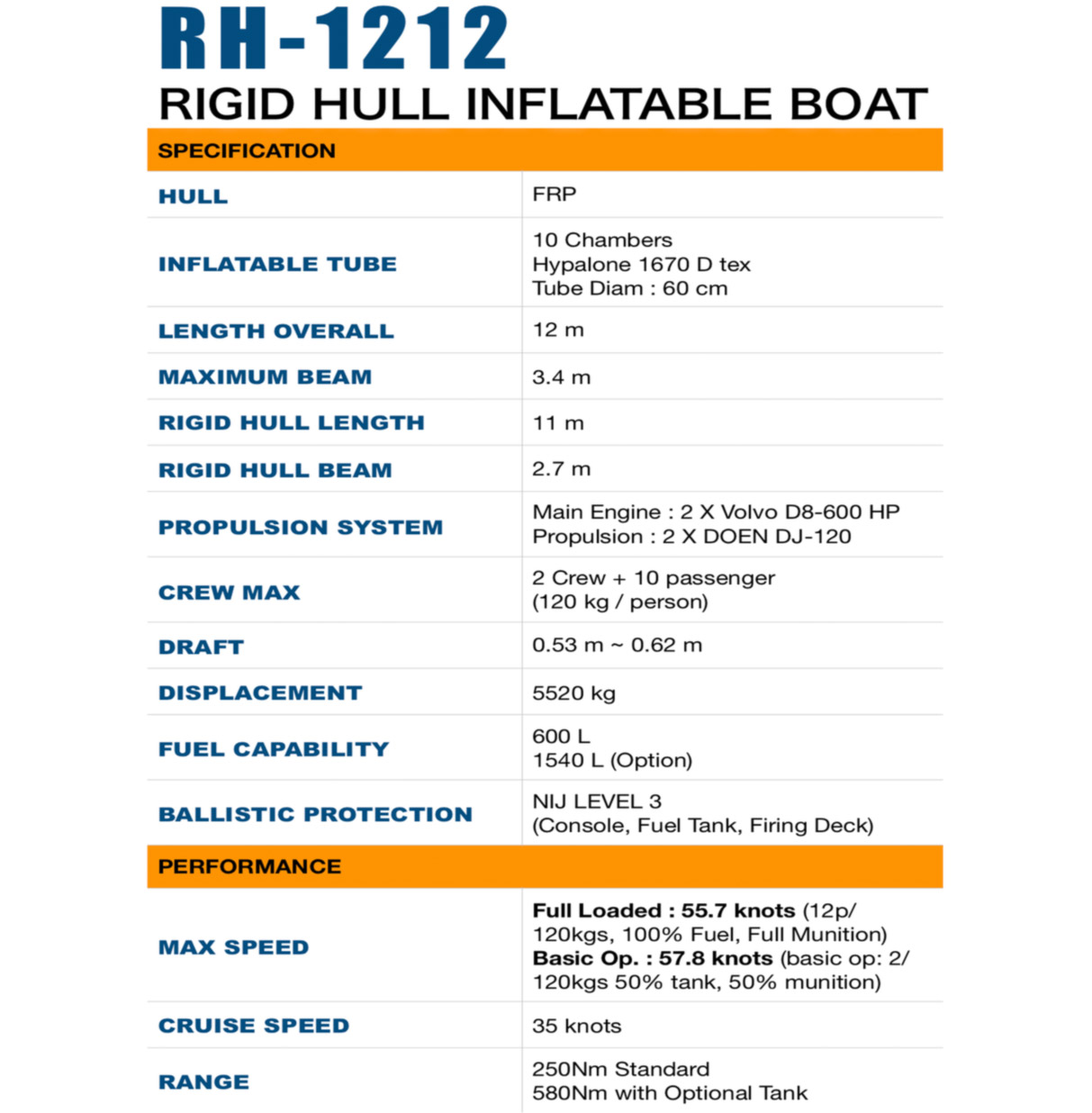 RHIB (Rigid-Hulled Inflatable Boat), RH-1212, in response to the latest international trends, andRH-1212 is ready to enter the international military market.